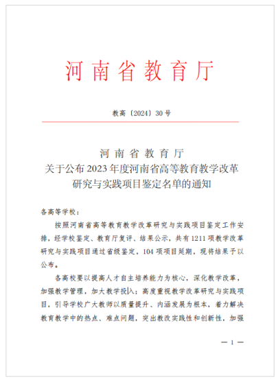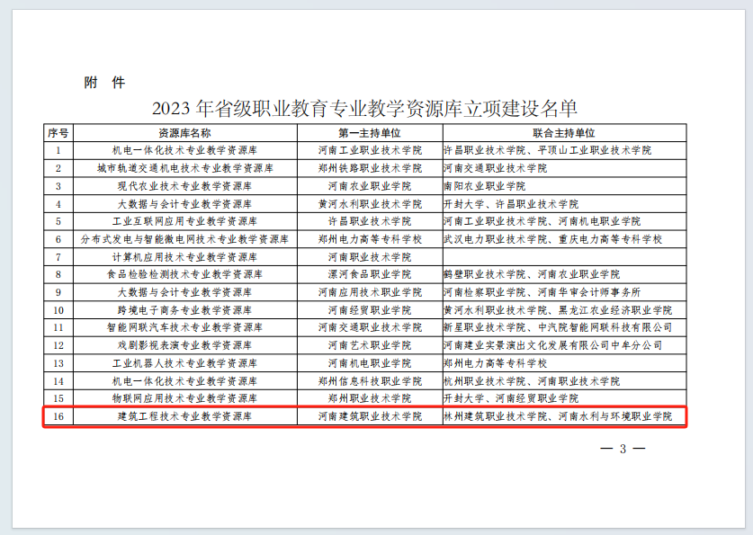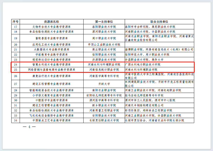 近日,河南省教育厅下发了《河南省教育厅办公室关于公布2023年河南省职业教育专业教学资源库立项建设名单的通知》(教办职成〔2024〕17号),我校主持的智慧水利技术专业教学资源库和联合主持的建筑工程技术、网络营销与直播电商专业教学资源库3个项目获批立项建设项目。目前,我校共7个(其中4个为主持单位)专业教学资源库获得省级立项建设。