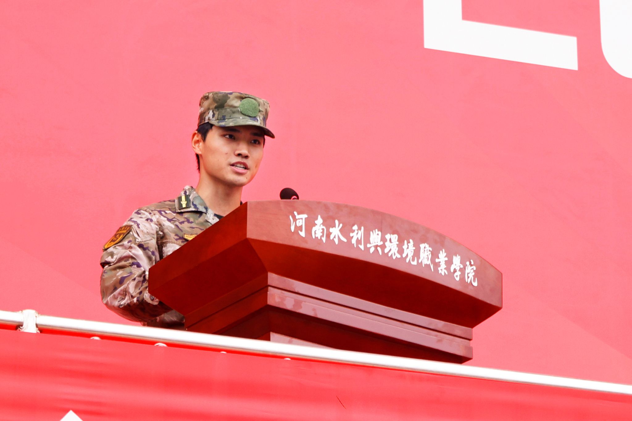 军训教官代表张鹏、杨勇发出号召,鼓励新生直面考验、超越自我,以昂扬斗志开启迷彩青春。
