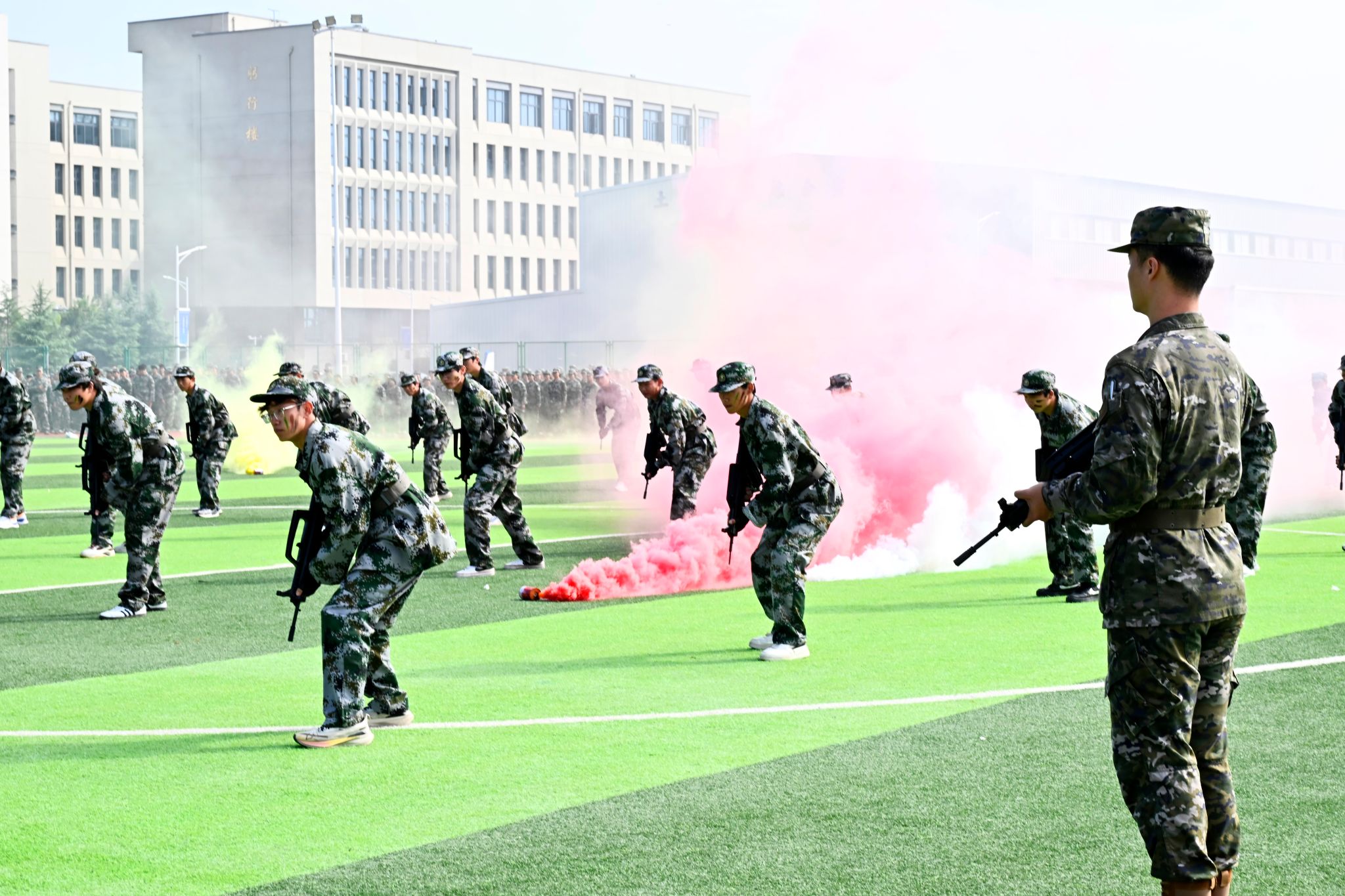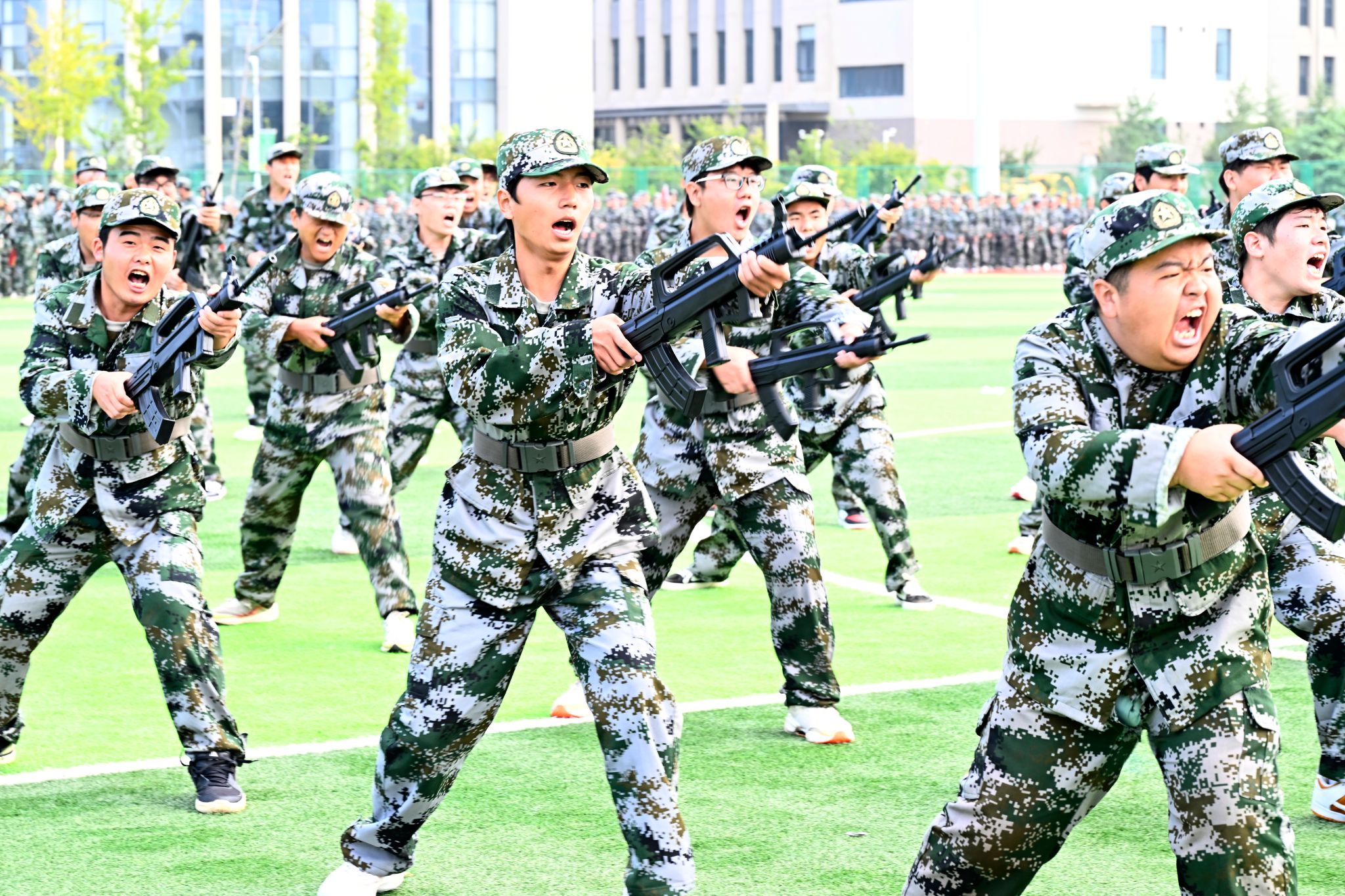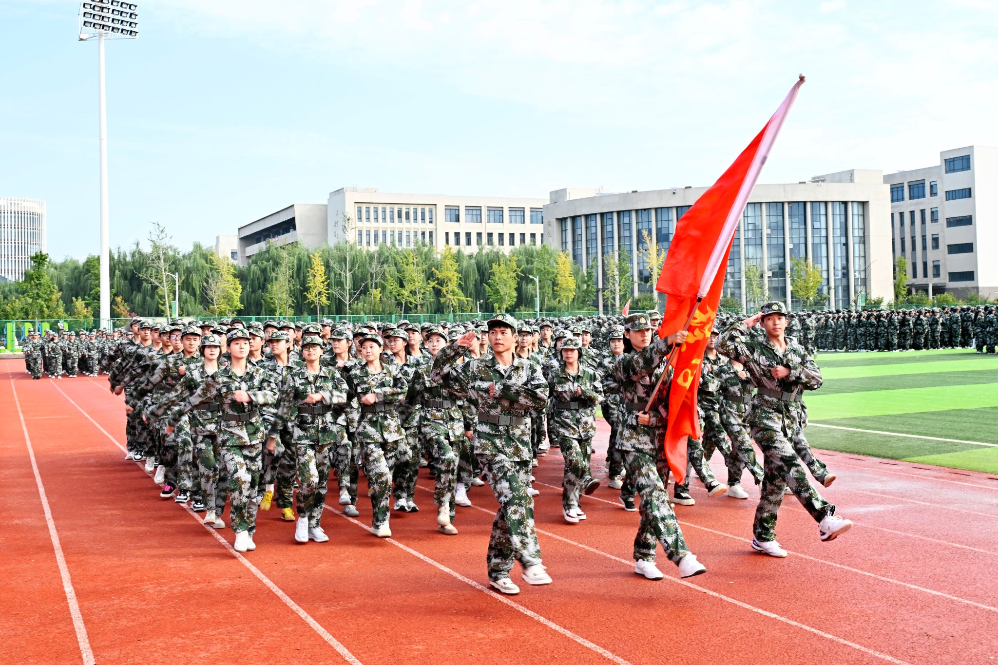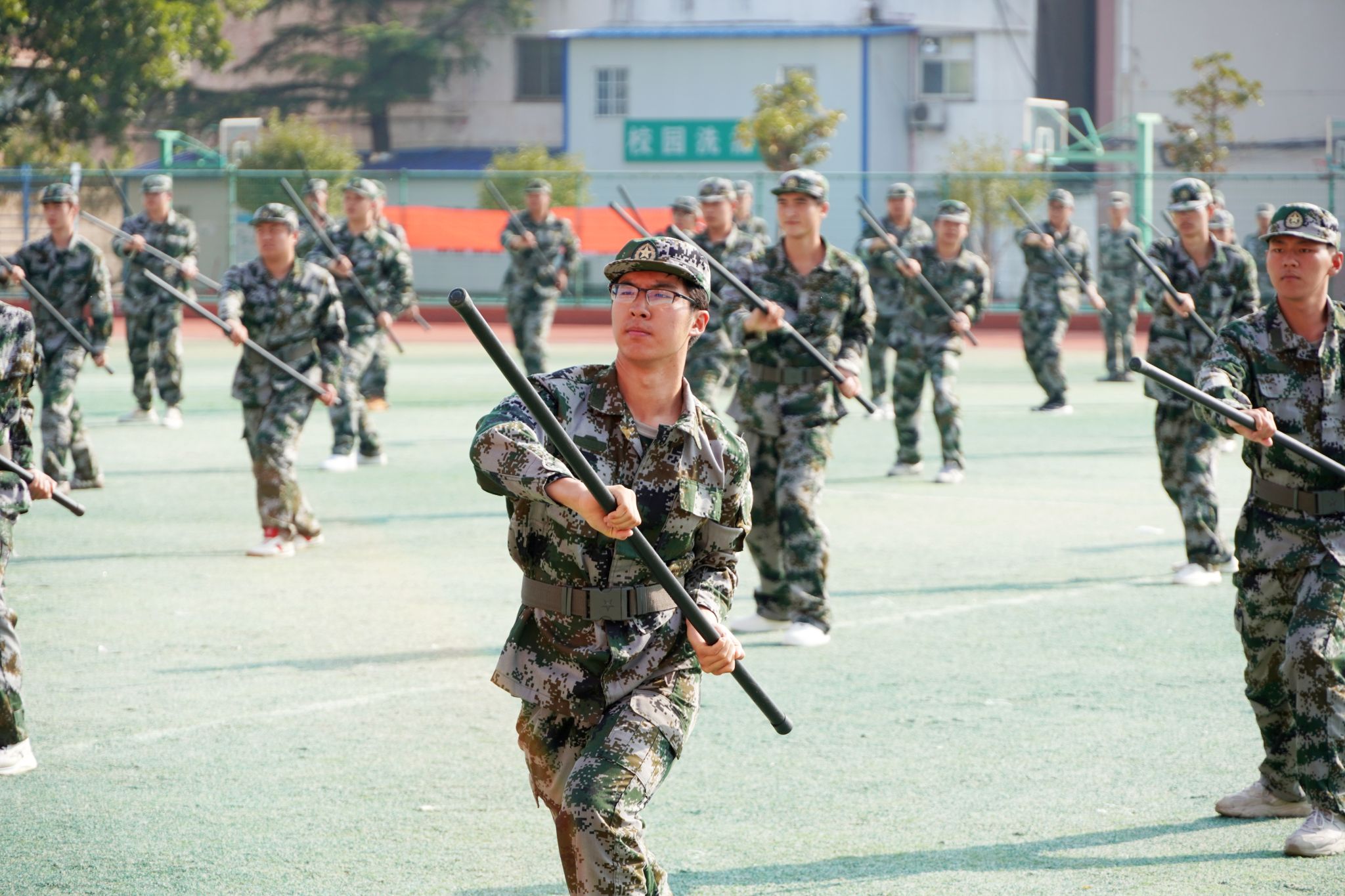 伴随着激昂的《分列式进行曲》,我校8000余名新生身着迷彩、昂首挺胸,以铿锵正步接受检阅,用一场热血的青春“阅兵式”,向新中国76周年华诞致敬。护旗方阵步伐精准,75厘米标准正步尽显庄严;数字方队、擒敌拳方队、刺杀操方队、战术方队、应急棍方队依次亮相,刚劲动作与嘹亮呼号交织,奏响青春强音,生动展现新生历经军训磨砺的昂扬风貌。