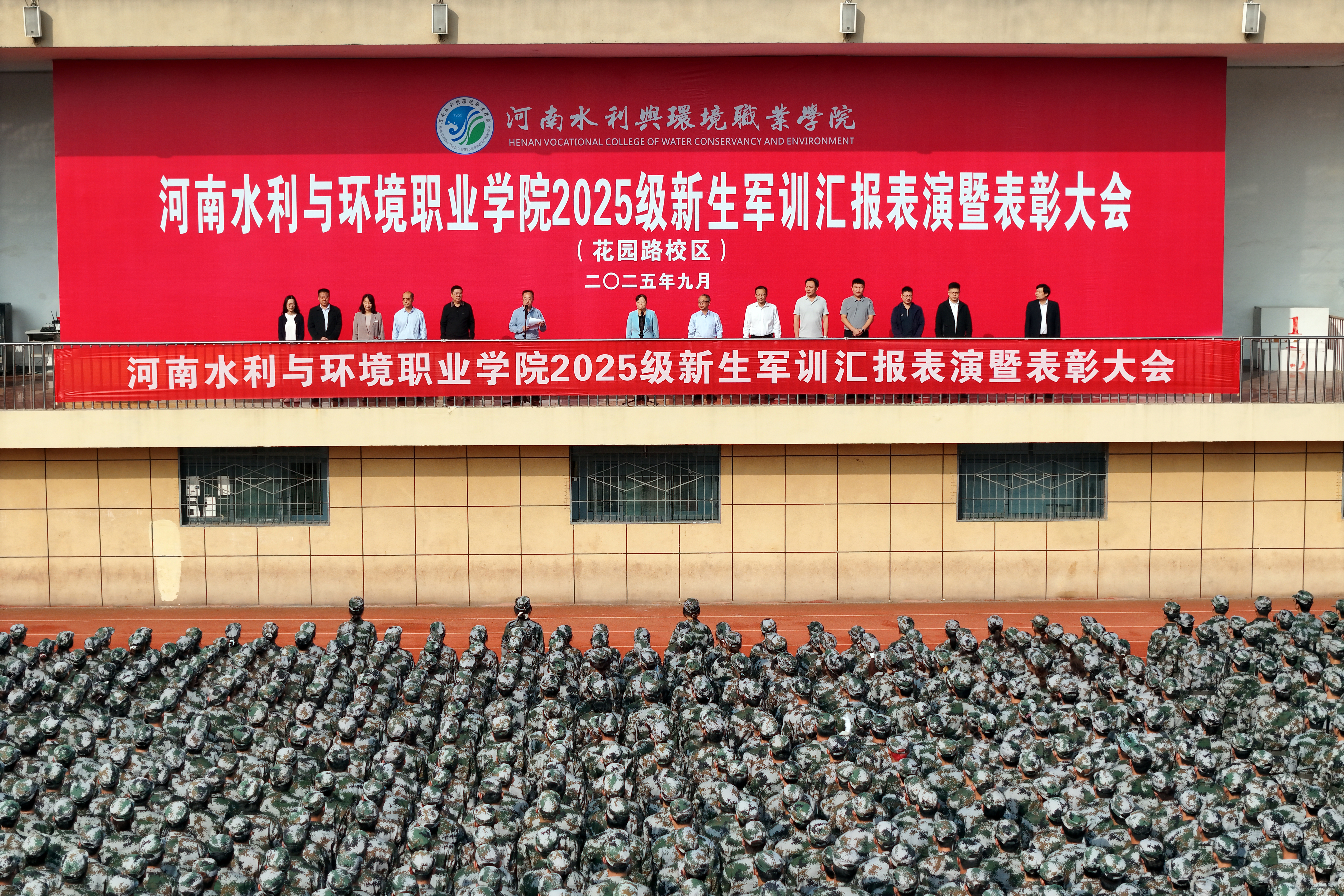 9月29日上午,我校2025级新生军训汇报表演暨表彰大会在花园路校区、航空港校区同步启幕。校领导班子成员出席,各职能部门及二级学院主要负责人参会,副校长张竟超、王玉振分别主持两校区大会。