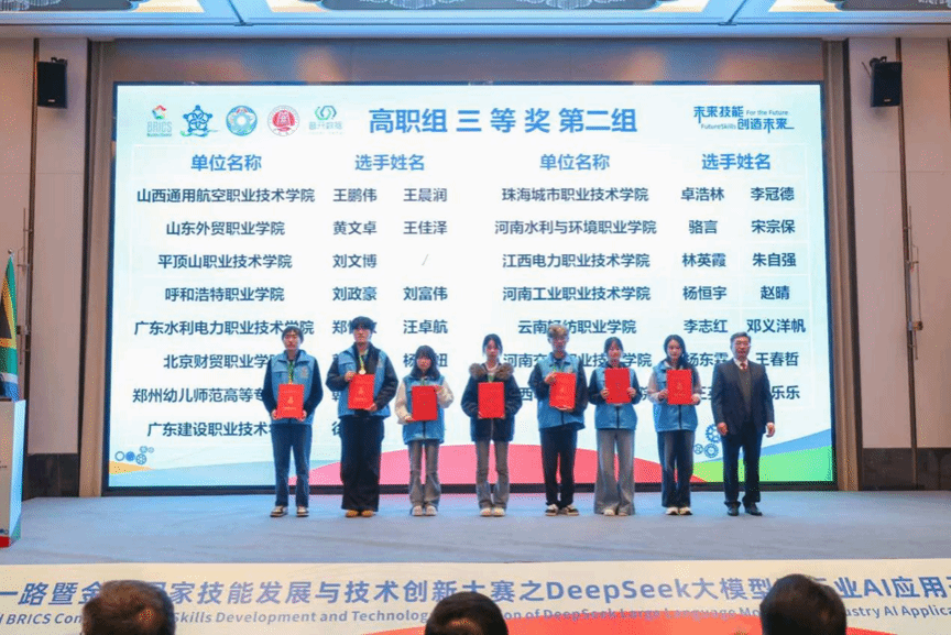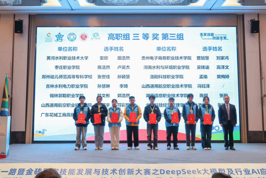11月6日至8日,2025“一带一路”暨金砖国家技能发展与技术创新大赛之首届deepseek大模型及行业ai应用开发赛项全国总决赛在开封大学成功举办。大赛设置本科组和高职组,共有来自全国150多支队伍参赛。经过激烈角逐,我校信息工程学院2支队伍脱颖而出,荣获全国三等奖2项。