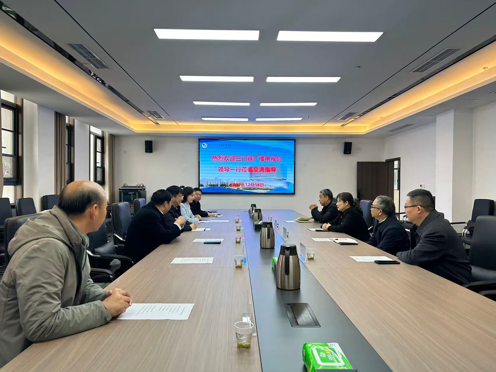 12月18日,三门峡广播电视台党组书记、台长呼延向阳一行五人,与河南金鹰建设集团董事长武晓辉、郑州康诺生物集团董事长张前进等校友企业家代表,齐聚我校航空港校区博学楼三楼会议室,围绕台校合作、校企协同等事宜开展交流座谈。校长李志萍,副校长包永刚,机关党委书记宋金晓,对外联络与合作中心(校友会)相关工作人员参加座谈。