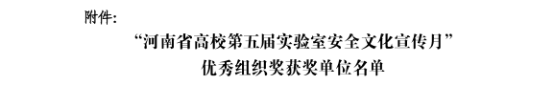 近日,河南省高校实验室工作研究会发布《关于表彰“河南省高校第五届实验室安全文化宣传月”优秀组织奖获奖单位的通知》(豫高实〔2025〕9 号),我校凭借在活动中的优异表现,再度荣获“优秀组织奖”,实现该奖项四连冠。