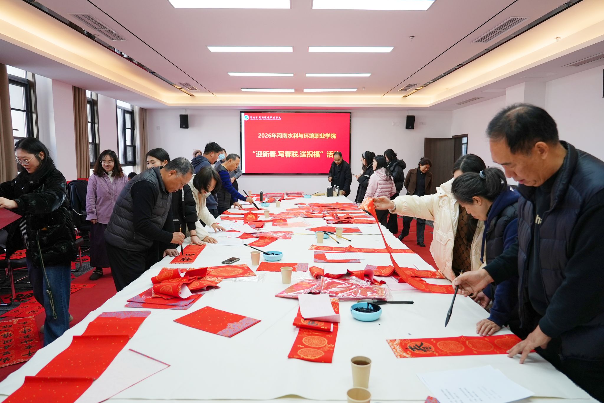 为喜迎新春佳节,弘扬中华优秀传统文化,丰富教职工校园文化生活,1月7日上午,校工会在航空港校区博学楼三楼会议室举办“写春联 送祝福”活动。校党委副书记、工会主席魏义军亲临现场,与百余名教职工共赴这场墨香四溢的文化盛宴。