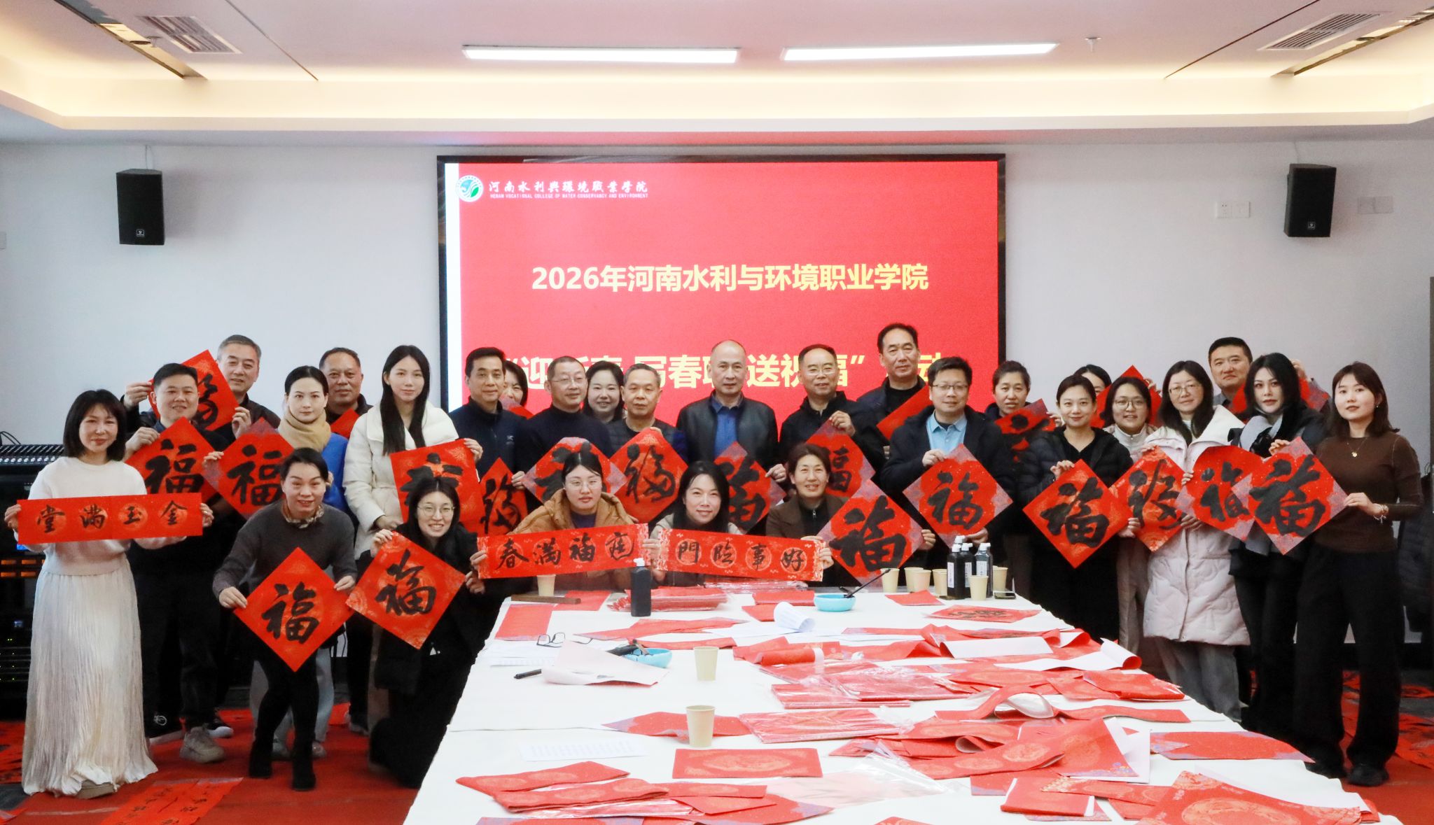 活动特邀河南水利书法协会6位书法家挥毫献艺,我校书法爱好者也踊跃参与、同台创作。活动现场暖意融融,红纸铺展,翰墨飘香。书法家与爱好者们凝神聚气、笔走龙蛇,将平安喜乐、和谐祥瑞的美好寓意融入一撇一捺之中,一副副对仗工整、寓意吉祥的春联,一个个遒劲有力、饱含温度的“福”字跃然纸上,浓浓的年味随着墨香扑面而来。