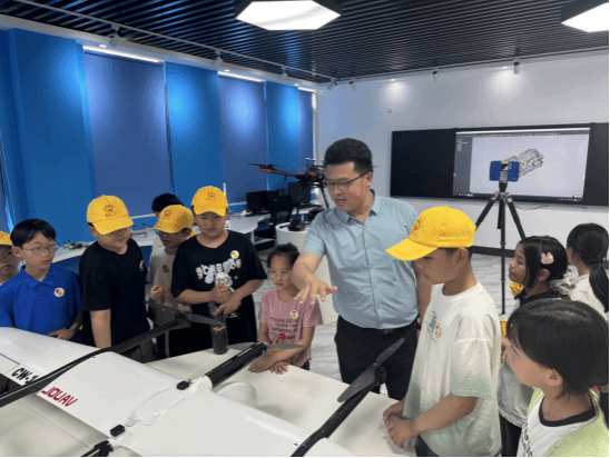 接着,研学团队参观了力行楼无人机实训室。讲解老师为小朋友们讲解了各类无人机的结构原理与应用场景,充分展示了无人机技术在航空摄影、环境监测、精准农业、物资运输及国防建设等领域的广泛应用。君赵小学刘校长表示,无人机技术不仅展现了科技创新的魅力,更为小学阶段孩子们的科技启蒙提供了优质素材。