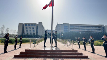 随着激昂的《义勇军进行曲》奏响,五星红旗冉冉升起,全体师生肃立行注目礼。