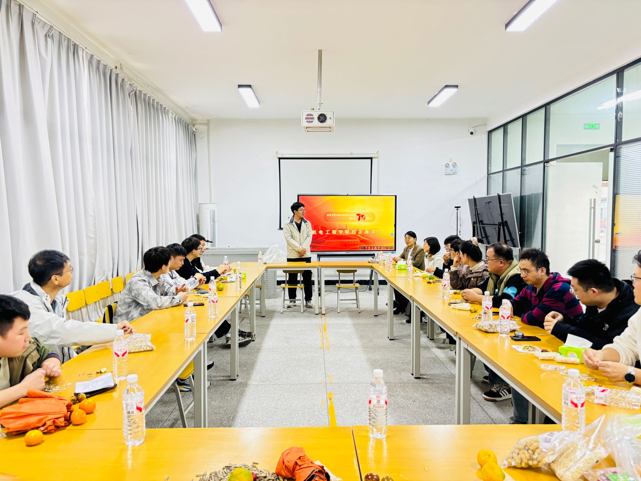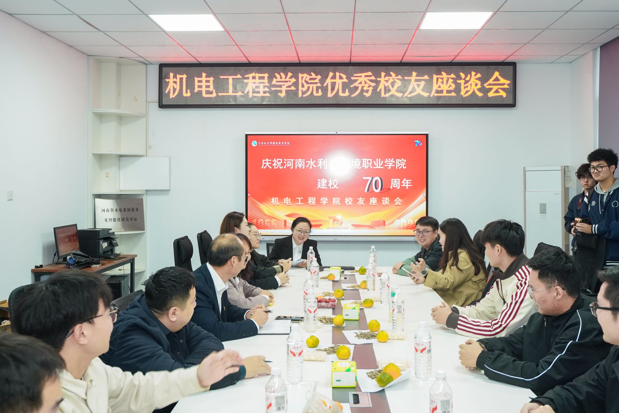金秋送爽,硕果盈枝。10月12日下午在我校喜迎70周年华诞之际,机电工程学院于花园路校区顺利举办校友返校日优秀校友座谈会。本次座谈会分为主会场和分会场。主会场嘉宾有学院党总支书记张国路、班子成员李戈,陈素,以及各届优秀校友代表,分会场由机电工程学院专任教师王明杰主持。各界毕业校友与学院教师代表齐聚一堂,共忆青春岁月、共商学院发展、共绘“智造”未来。
