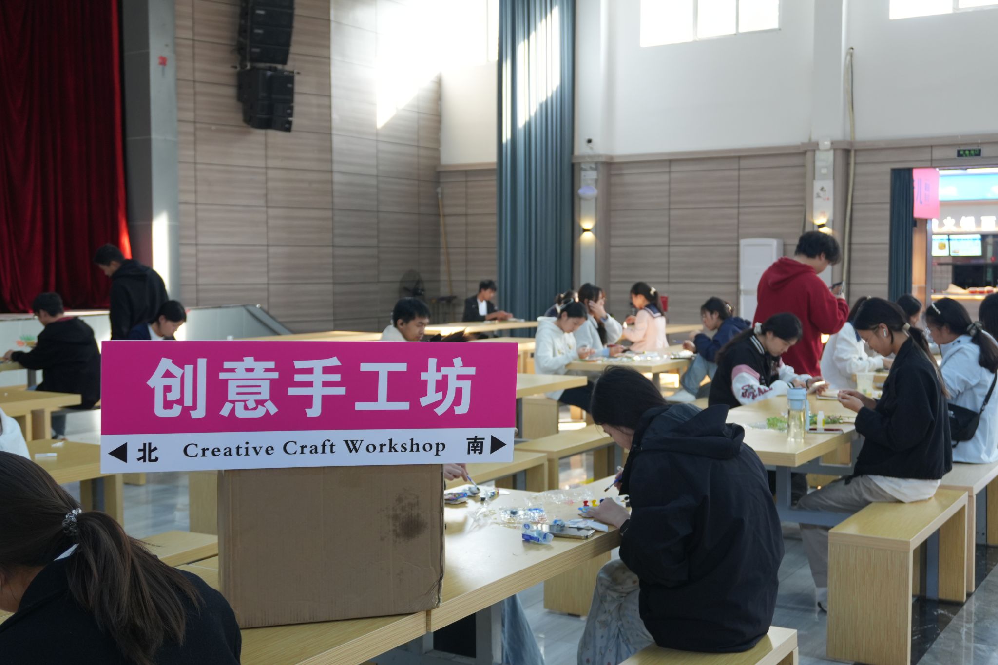 四大特色项目紧扣学生兴趣需求,注重参与感与沉浸感,让周末校园焕发别样活力。在“创意手工坊”,纸艺创作、干花扇子diy、填色画本等丰富品类供学生选择,大家专注构思、巧手制作,纷纷与专属手作合影留念,在实践中收获满满的成就感;“校园广场舞”于傍晚时分在室内体育场与c5门前小广场同步开启,大学生艺术团成员带领大家随着流行青春曲目起舞,简单易学的动作吸引越来越多学生自发加入,欢声笑语弥漫校园夜空;“剧本杀”专区精选校园青春主题剧本,配备专业dm引导,6-8人一组的沉浸式体验让学生快速代入角色,激烈的推理讨论与深度剧情互动,让现场氛围既紧张又充满趣味;“一起来唱吧”活动搭建专业k歌舞台,完善的音响与点歌系统支持学生自由点唱,无论唱功高低,学子们都踊跃登台展示自我,台下观众自发鼓掌合唱,现场俨然成为一场热闹非凡的校园音乐派对。
