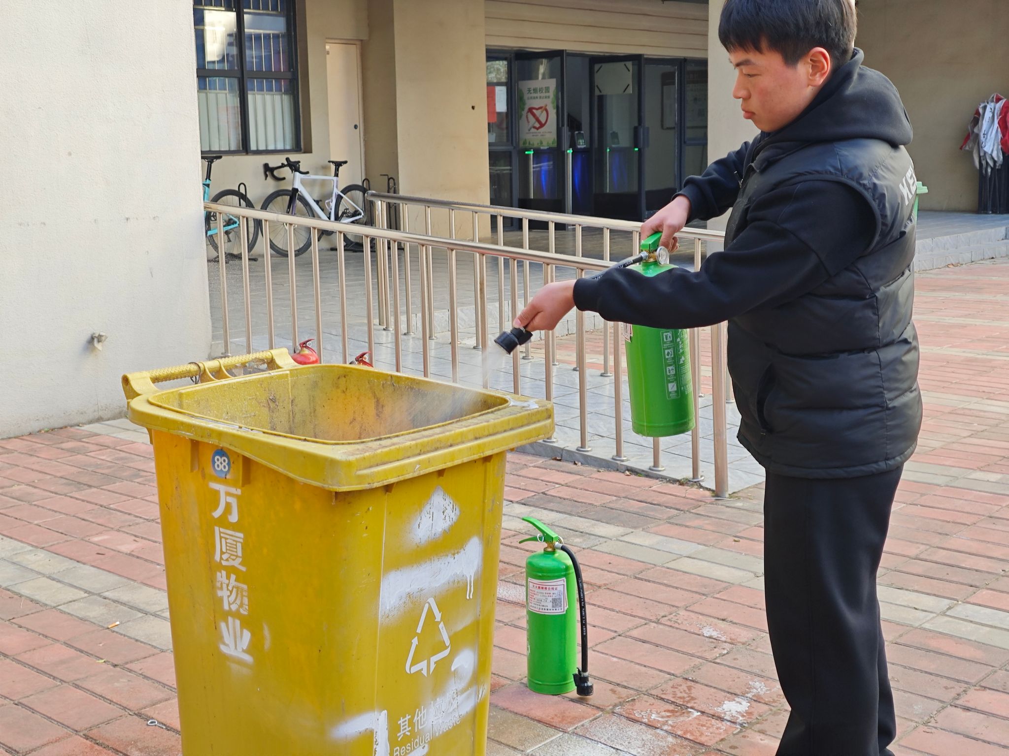 在消防实战演练活动中,师生们反应迅速、配合默契。学校党委安全工作部教师结合高校火灾特点,现场开展消防安全培训,系统讲解了火情识别、初期处置方法、火场逃生技巧及报警信息规范上报等核心内容,通过“理论讲解 实物演示”的方式,详细介绍了干粉灭火器、水基灭火器等常用消防器材的适用场景与操作步骤。在实操环节,同学们在指导下依次完成灭火器提、拔、握、压的规范操作,切实将安全知识转化为应急处置能力。