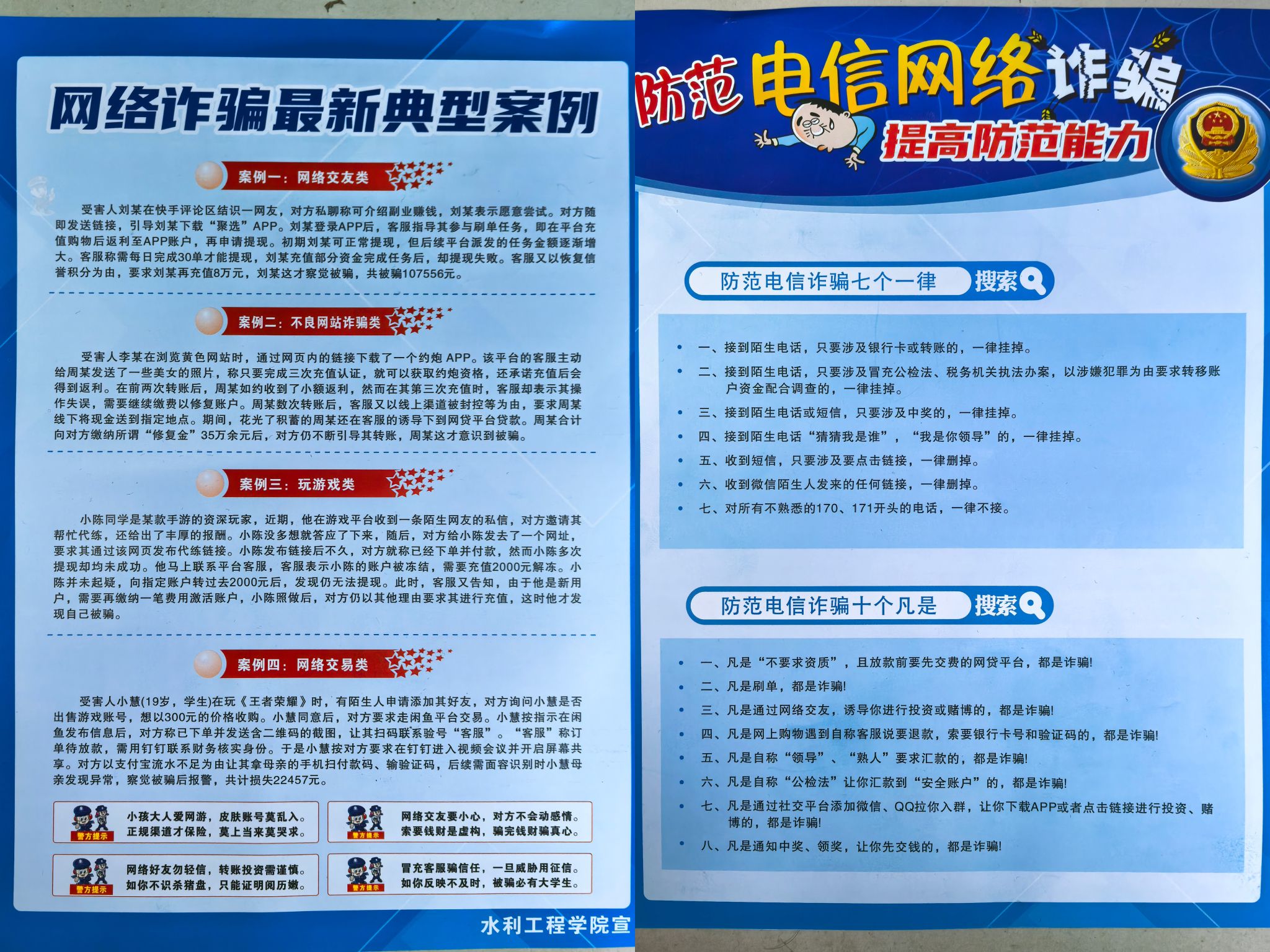 为积极响应构建平安校园的号召,切实提升学生防范电信网络诈骗的意识和能力,有效遏制校园诈骗案件发生,水利工程学院于11月20日至26日举办“防诈同心 安全同行”主题系列活动。