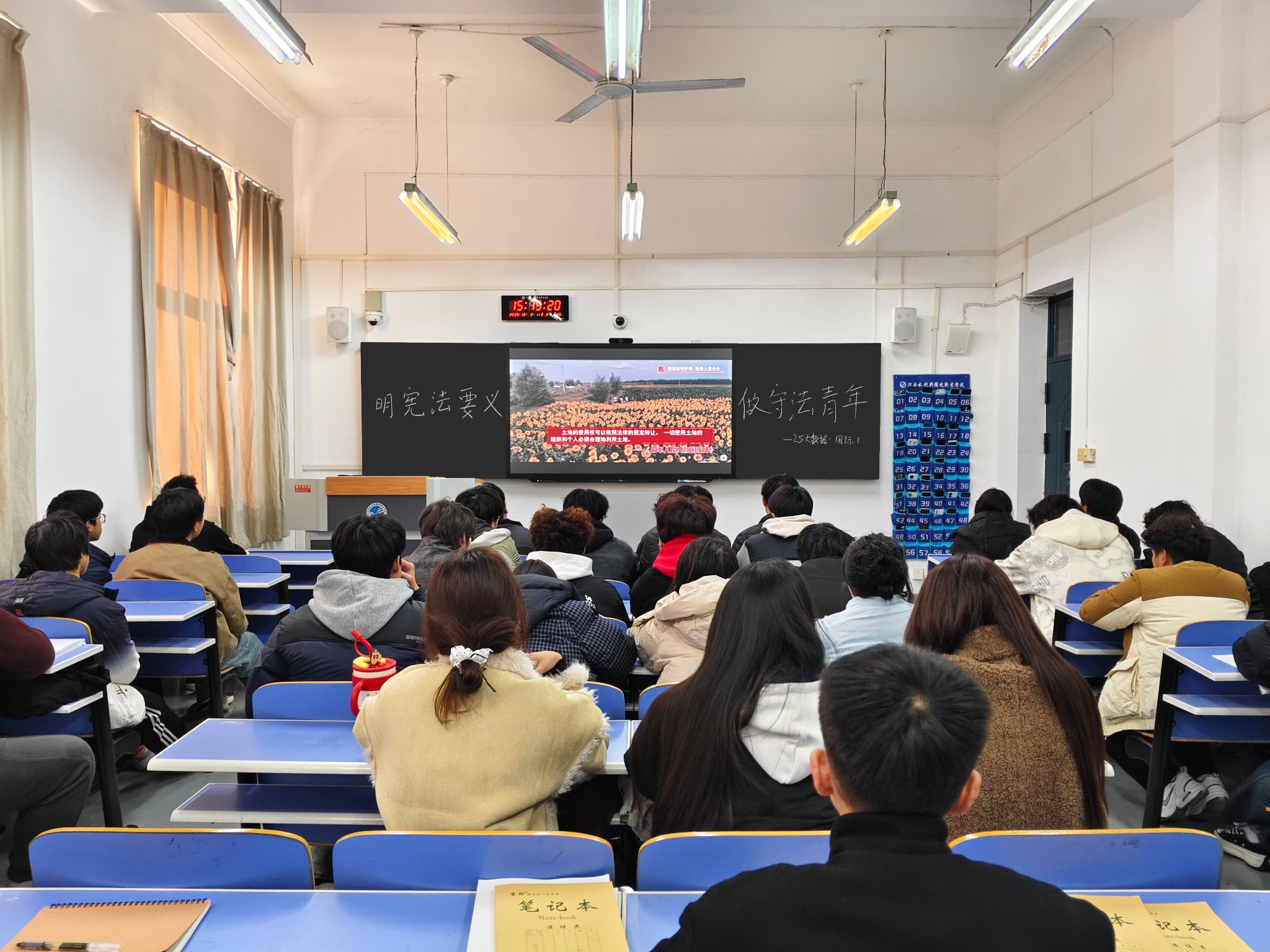 环境与生态学院于 12 月 4 日精心组织“宪法伴我行,法治入我心”主题活动。活动伊始,主持人介绍国家宪法日背景、意义及活动安排,激发参与热情。趣味游戏环节设置“12.4 秒读宪法”“宪法连连看”“宪法拼贴诗”三个特色板块,将宪法知识与互动体验巧妙融合。当日下午,各班集中观看《“宪”给少年的你》主题直播,同学们思考宪法与成长的关联,交流感悟,深化对“宪法就在身边”的理解。离场时,同学们主动清理垃圾、归位座椅,展现良好素养。