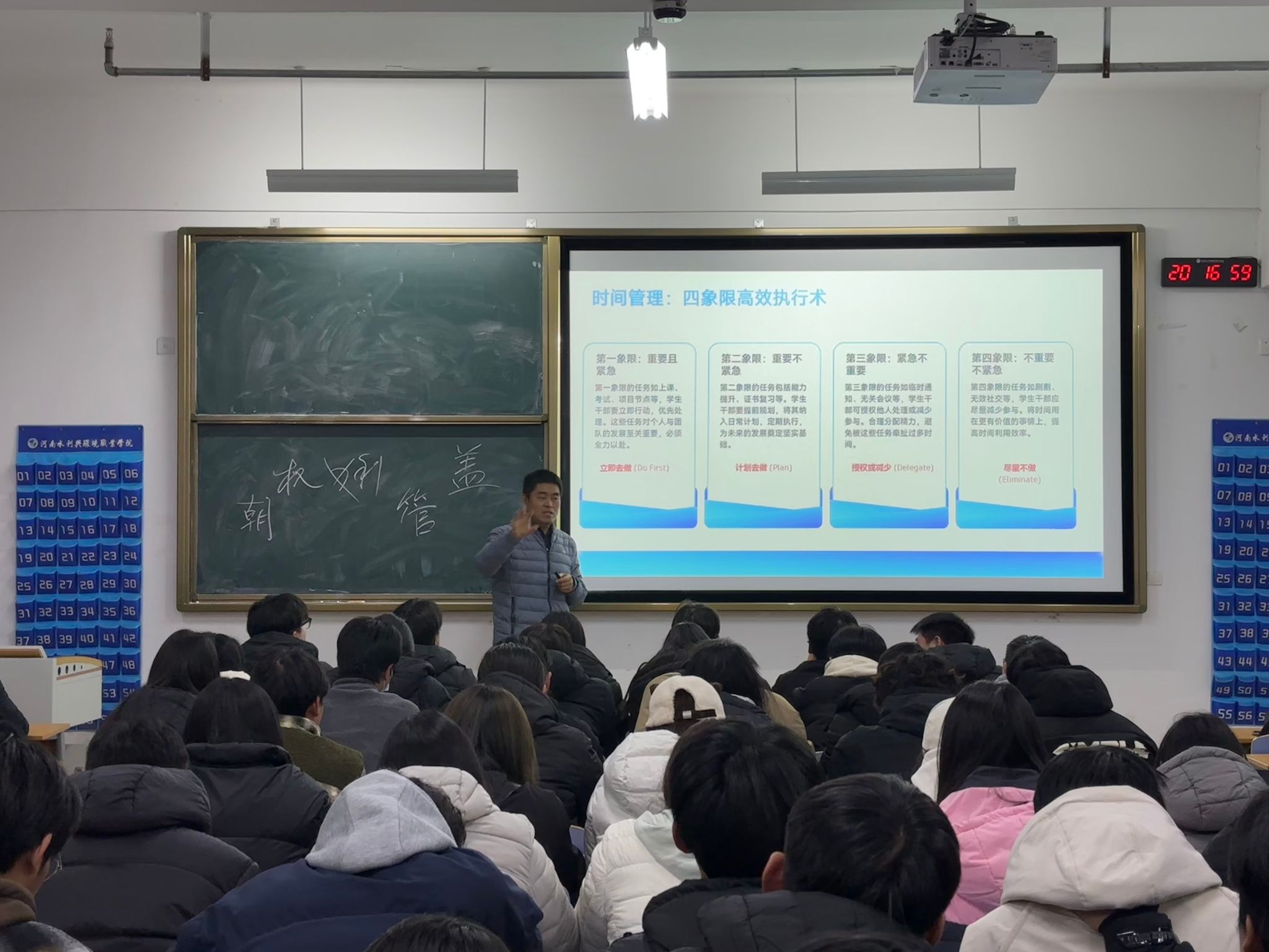 结合实际工作场景,钟含要求学生干部着重提升项目策划、方案设计以及解决复杂问题的能力,推动工作思维从“被动执行”向“主动创造”转变。针对会议组织、活动举办、公文写作等日常工作,他给出标准化操作指南,细致梳理全流程关键要点,将实践经验转化为可复制推广的工作方法。此外,围绕学生干部的可持续发展,他还分享了时间管理、压力疏导与情绪调节的科学技巧。