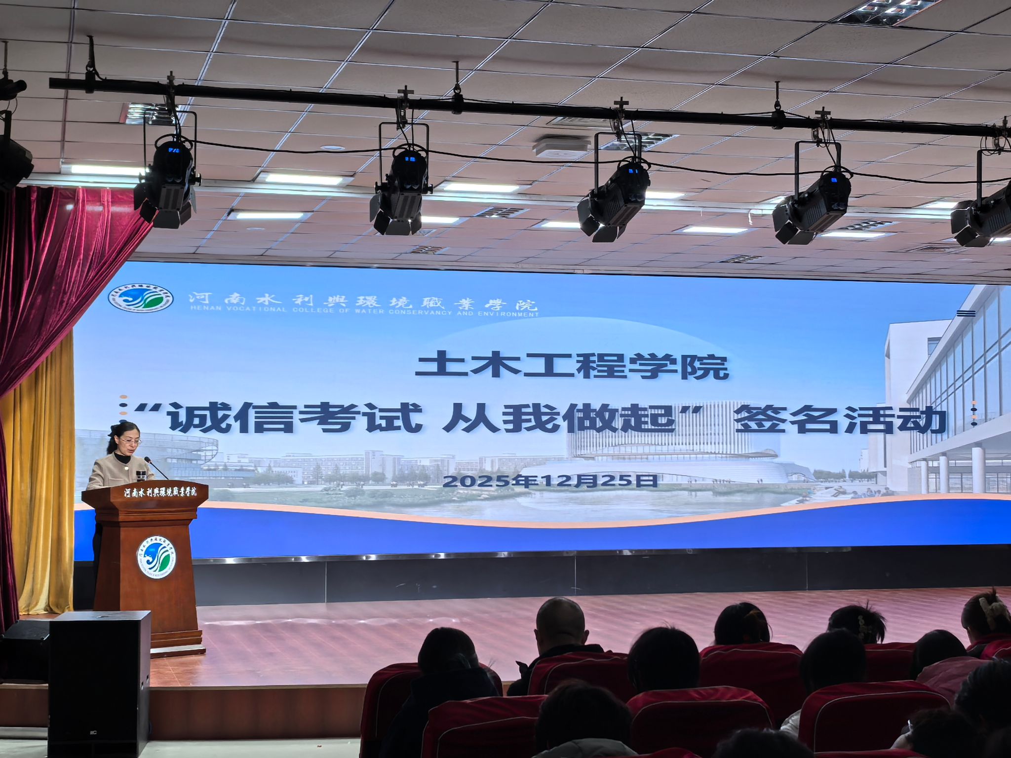 学生代表结合土木工程专业特色宣读诚信考试倡议书,倡议书通过“桥梁的稳固始于坚实的地基”等生动比喻发出“树诚信之念、行自律之举、扬正义之风、践庄严之诺”四项倡议,传递学子守护考试公平的责任担当。