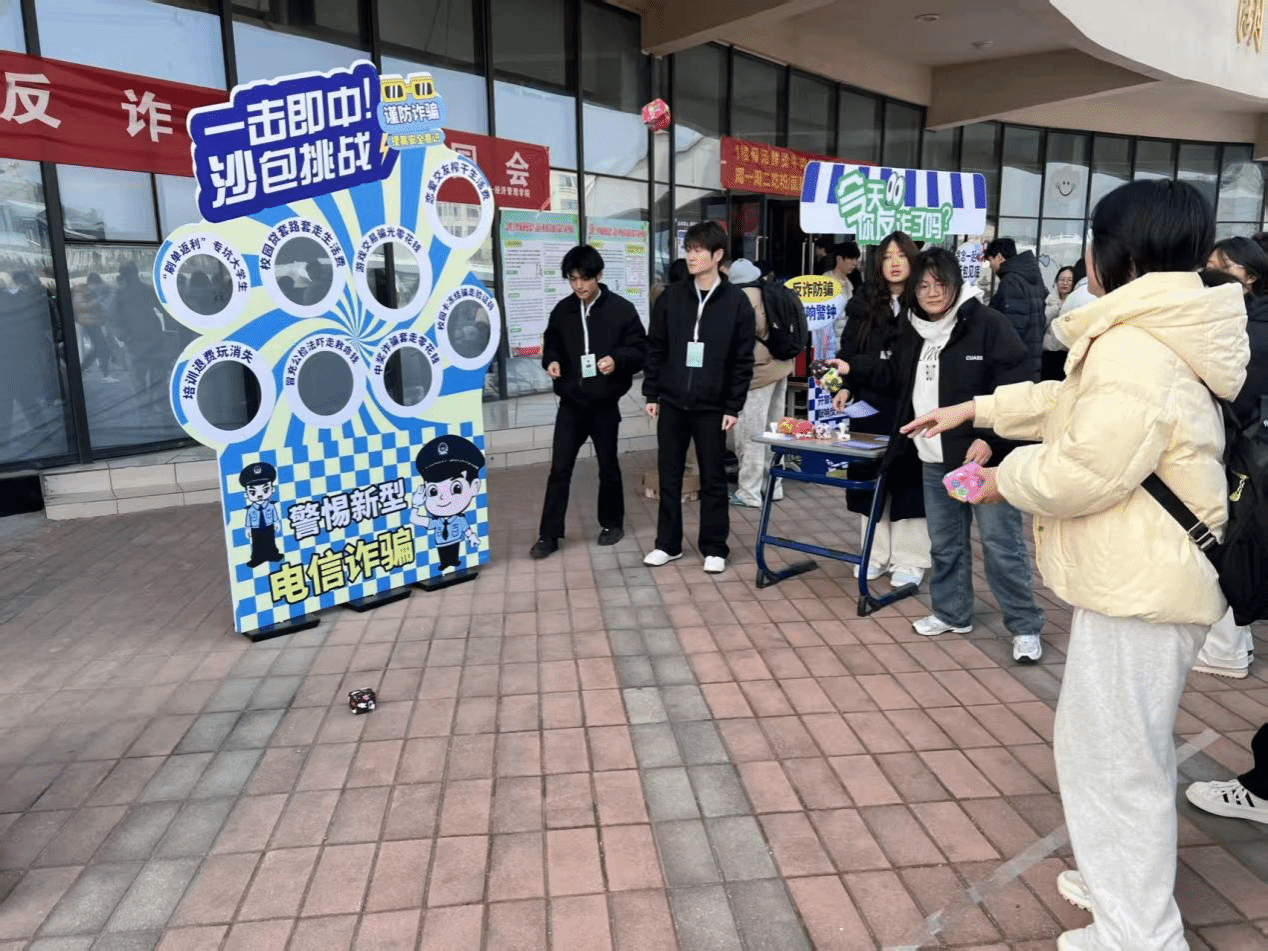本次游园会设置四大闯关环节,将反诈知识深度融入趣味游戏。师生通过下载国家反诈中心app、关注学院公众号完成反诈工具闯关,在投沙包、套圈等互动游戏中强化防诈意识;“视力表辨真假”环节则以常见诈骗话术为内容,帮助师生精准识别骗局。活动中,参与者集齐印章即可兑换礼品,现场参与热情高涨、气氛热烈。