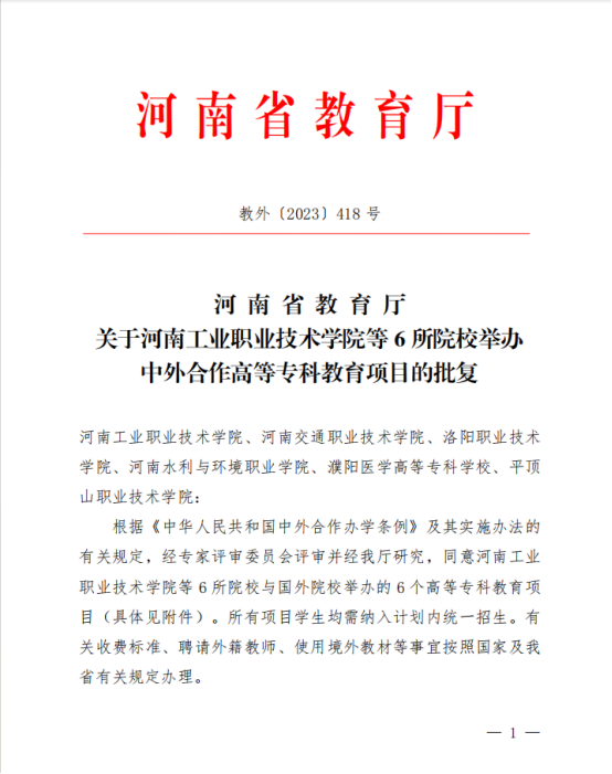 12月19日,河南省教育厅印发《关于河南工业职业技术学院等6所院校举办中外合作高等专科教育项目的批复》(教外〔2023〕418号),我校与英国博尔顿大学的大数据技术专业中外合作高等专科教育项目成功获批。